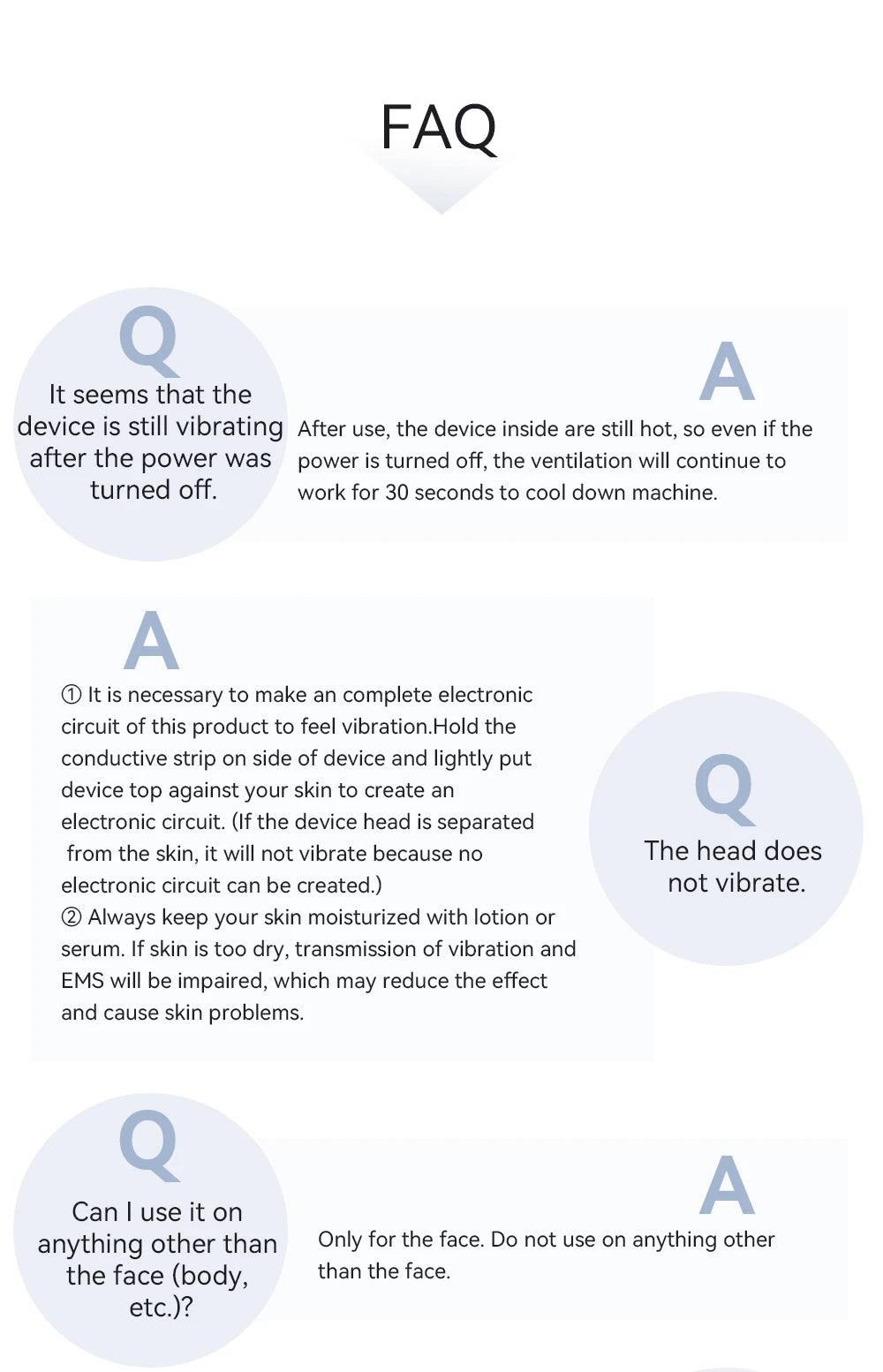 A: ① It is necessary to make an complete electronic circuit of this product to feel vibration.Hold the conductive strip on side of device and lightly put device top against your skin to create an electronic circuit. (If the device head is separated from the skin, it will not vibrate because no electronic circuit can be created.)
